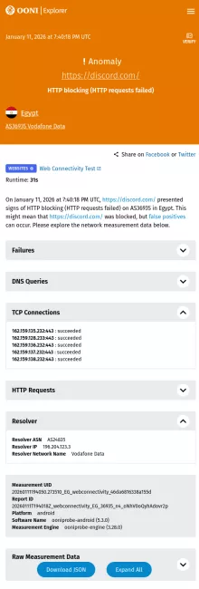 وأظهر الرصد تطابق هذا النمط على الشبكتين وكلا النطاقين، ما يعزز أن التعطيل لا يرتبط بإعدادات محلية تخص المستخدمين، وإنما ببيئة الشبكات داخل مصر. وظل هذا الحجب قائمًا حتى رُفع، وعاد ديسكورد للعمل بصورة طبيعية.