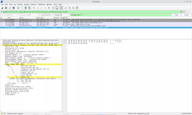 كما تُظهر ملفات الالتقاط أثناء الاستخدام الفعلي النمط ذاته داخل جلسات التطبيق نفسها، مع إغلاق قسري لاحقًا للاتصال (RST/ACK) رغم أن اتصالات آمنة أخرى داخل البيئة نفسها تكتمل بصورة طبيعية.