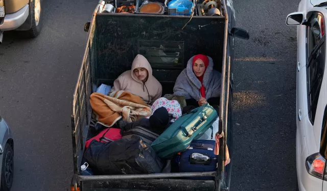 نازحون يفرون من الغارات الإسرائيلية على جنوب لبنان، يجلسون في صندوق شاحنة "بيك آب" على الطريق السريع المؤدي إلى بيروت، في مدينة صيدا الساحلية الجنوبية، الاثنين 2 مارس 2026.